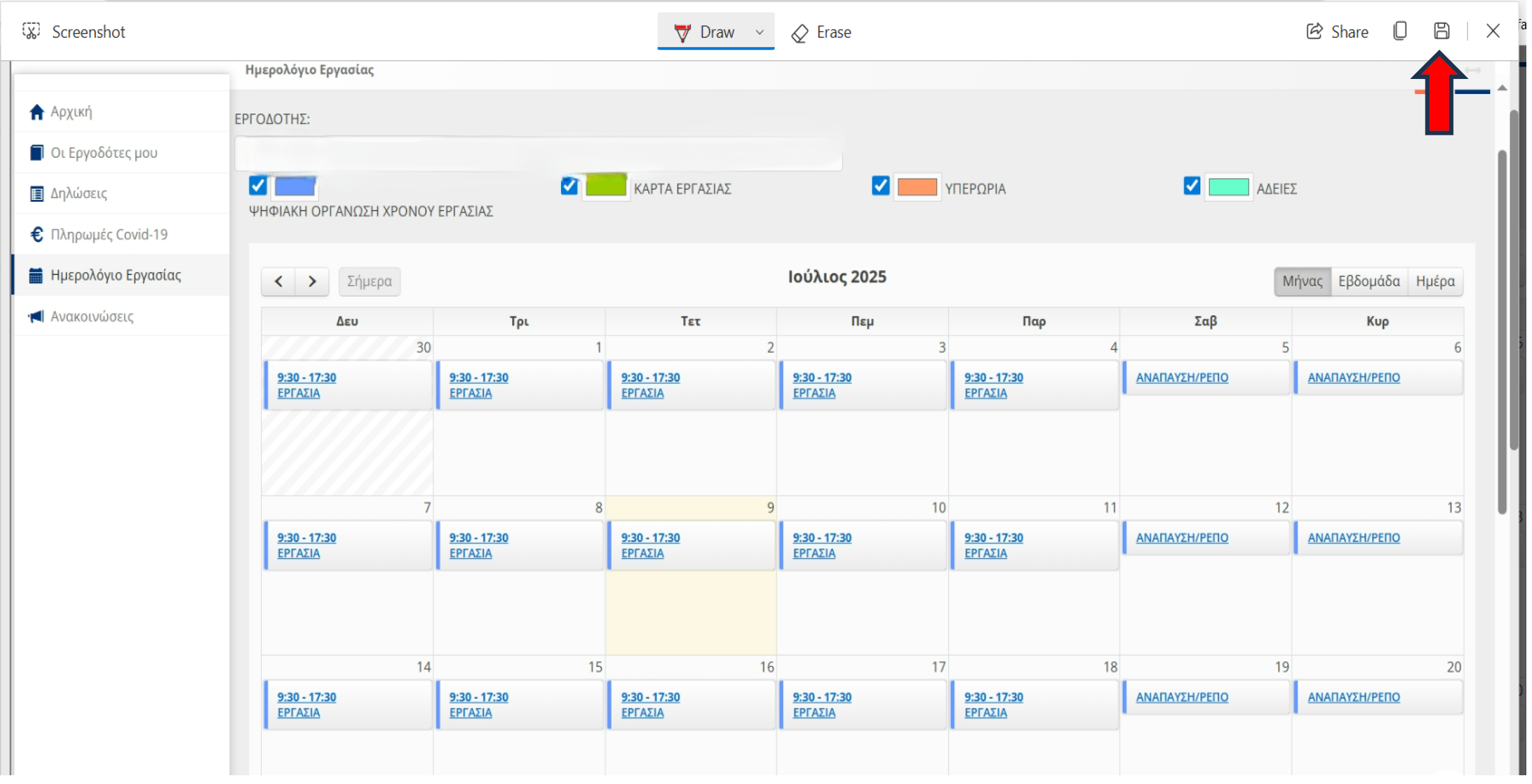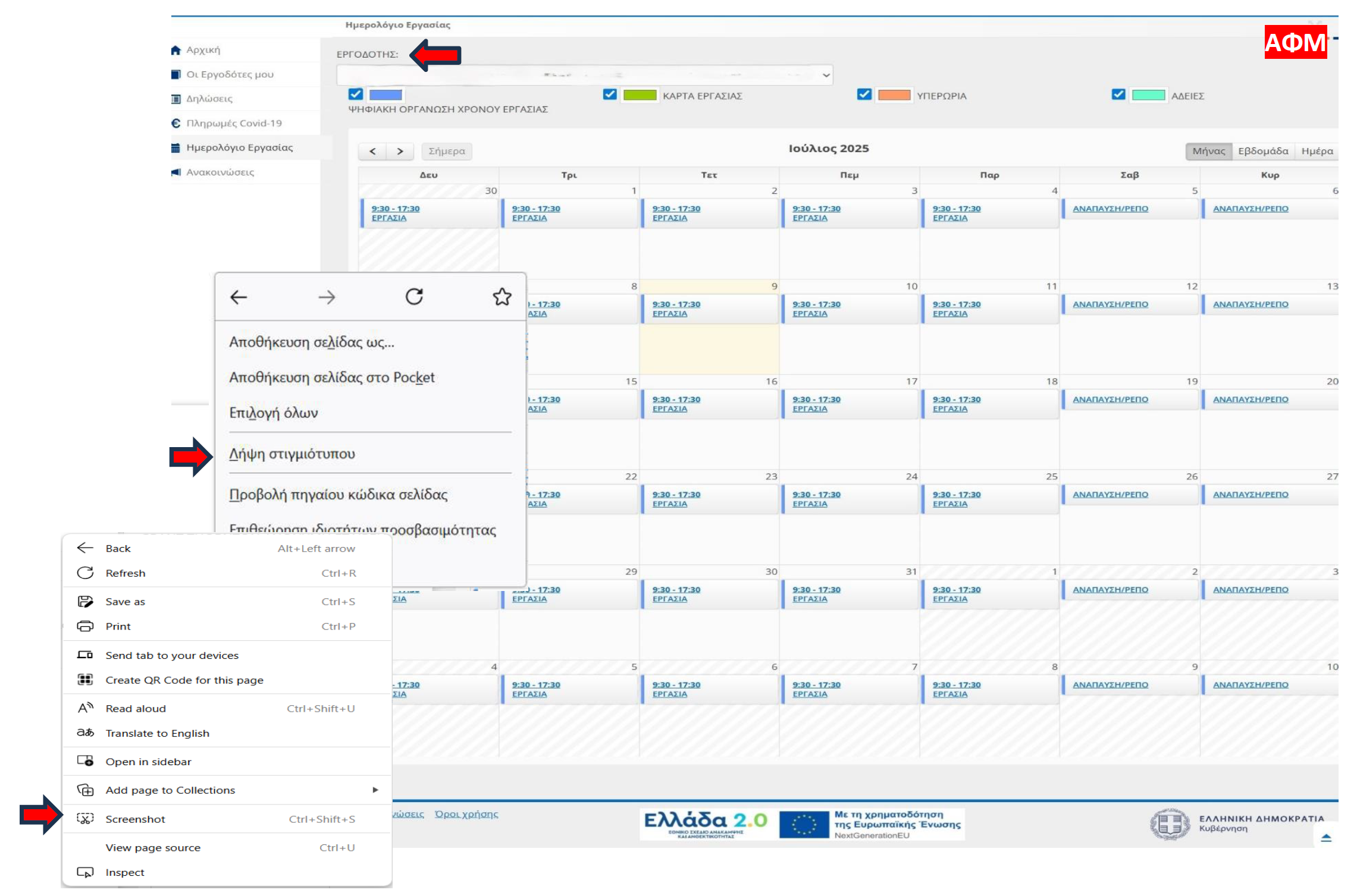 Θα μας εμφανιστεί αυτή η οθόνη. Βλέπουμε το ΑΦΜ μας επάνω αριστερά και το ωράριο εργασίας μας. Σε αυτό το στάδιο, θέλουμε να αποθηκεύσουμε την οθόνη σε μορφή PDF. Μέχρι εδώ, οι οδηγίες είναι ίδιες, ανεξάρτητα συσκευής. Παρακάτω υπαρχουν οδηγίες, εξατομικευμένες ανάλογα με τη συσκευή/εφαρμογή περιήγησης που χρησιμοποιείτε.